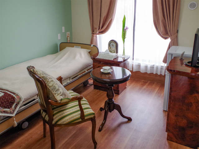 | 居室設備 | ベッド、寝具一式、ワードローブ、ナイトテーブル、リクライニングチェアー、緊急通報付電話機、緊急コール、ペンダントコール、床暖房、カーテン、エアコン、テレビ、照明器具、テーブル、椅子、3点式ユニットバス |