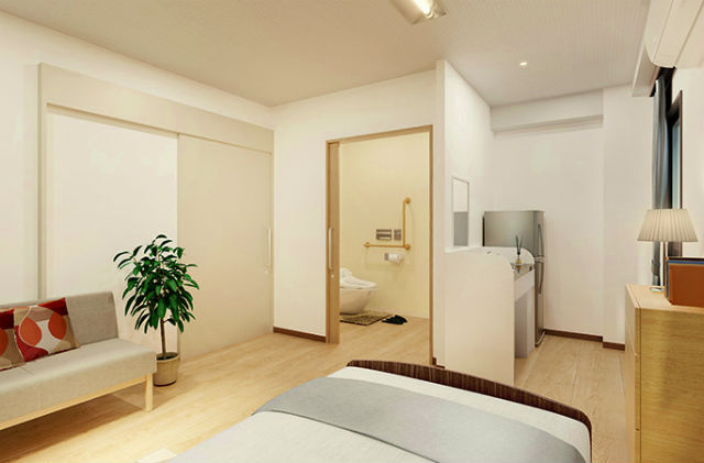 | 居室設備 | 介護用電動ベッド、寝具、冷暖房、カーテン、トイレ(全居室完備、洗浄機付)、温水器付洗面所、ミニ冷蔵庫、ソファベッド、電子レンジ、 照明、消防設備(自動火災報知設備、スプリンクラー)、テレビ回線、ナースコール(2か所/トイレ・ベッド)、見守りセンサー |