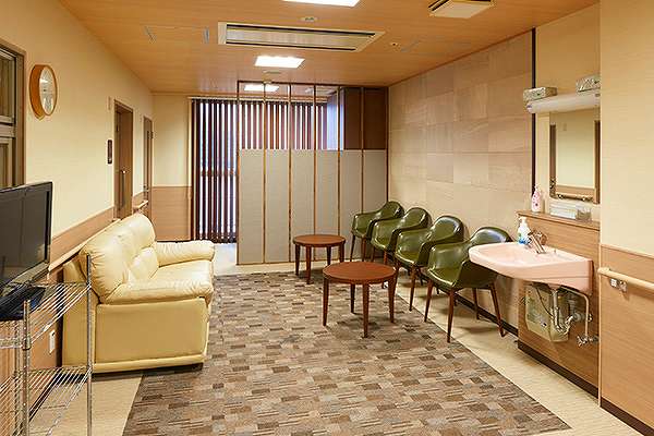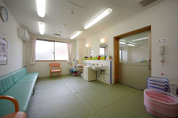 共有スペースは車イスに対応した共用トイレや、ご入居者様で、のんびり寛いで頂く談話コーナー、陽のあたる食堂がございます。また、浴室には畳が敷かれており安全かつ暖かみのある大浴場となっております。