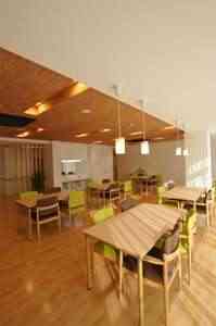 外壁には、シンプルさと高級感を併せ持つモノトーンタイルを採用。地域の風景と調和したデザインとなっています。バルコニーの手摺はガラスを使用。2階、3階の室内からでも光や緑を多く取り込むことができます。食堂は、木目調の材料を多用することにより、明るさと清潔感のある空間が広がります。