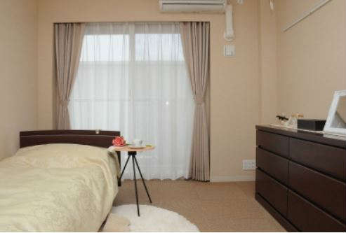 | 居室設備 | 介護ベッド(3モーター)、防炎カーテン、エアコン、洗面、温水洗浄機能付トイレ・チェスト、収納、スタッフコール、照明 |
