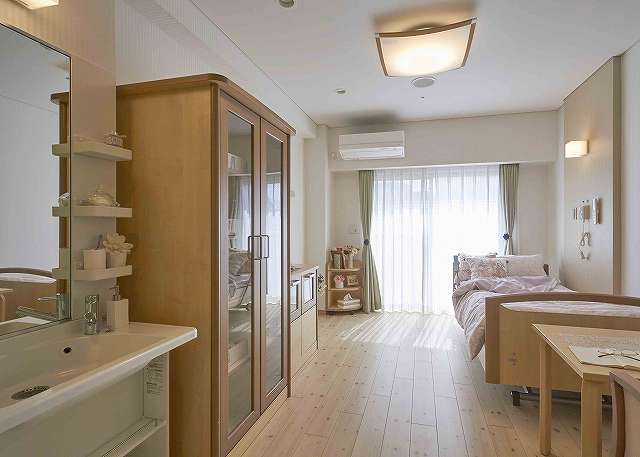 | 居室設備 | 介護用電動ベッド/寝具/照明/冷暖房/クローゼット/洗面所/ 防火設備(スプリンクラー、熱感知器、非常時放送スピーカー)/トイレ(洗浄機能付)/防炎カーテン/ケアコール/テレビ回線/電話回線 |