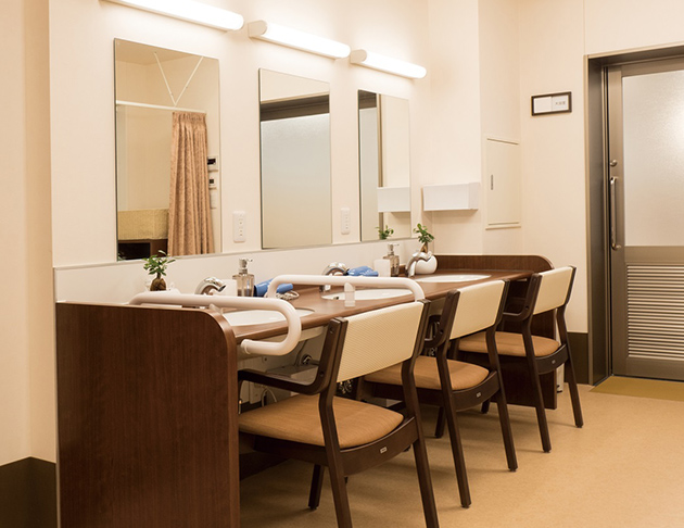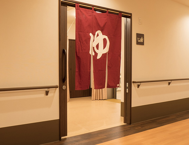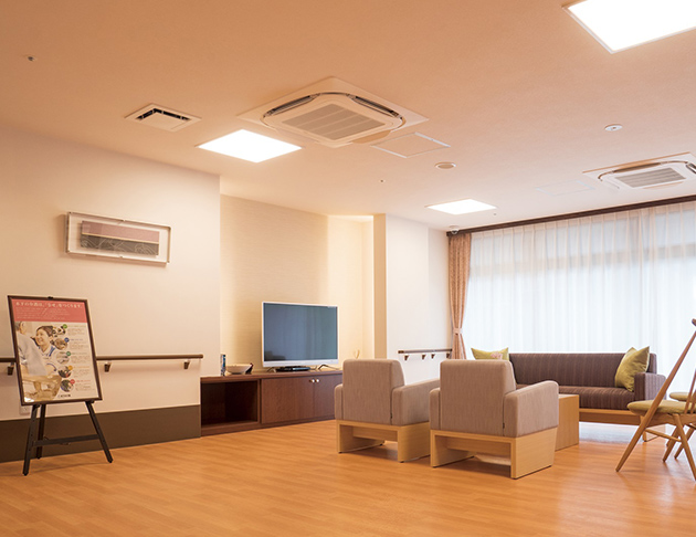 共用部:大きな窓と広く明るい空間に食堂兼機能訓練室があるので、ゆったりとお過ごしいただくことができます。また浴室は個浴や大浴場の他に機械浴もありお身体の状態に合わせた入浴ができますので安心です。