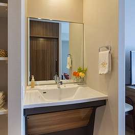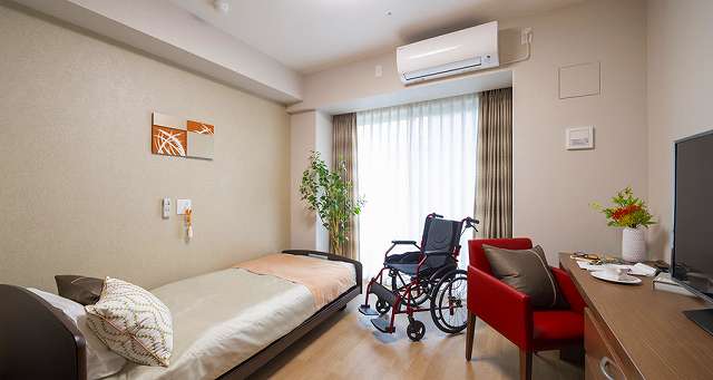 緊急コールボタン(ベッド・トイレ)、エアコン、温水洗浄トイレ(背もたれ、両側手すり付)、洗面台、TV端子及び電話機端子、電動ベッド、寝具、カーテン、デスク、チェア、収納 ツインルームのみ:ミニキッチン・ユニットバス・トランクルーム |