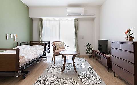 | 居室設備 | 電動介護ベット、ウォシュレット付きトイレ、浴室、エアコン、IH調理器、緊急コール、洗面台、クローゼット、下駄箱、折りたたみベンチ、照明器具、地上波アンテナ、防火カーテン、スプリンクラー、バルコニ |