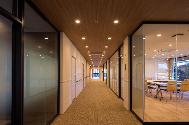 建物内は手すりの設置や段差をなくす等の転倒の防止に配慮。居室や共用さらに詳しく