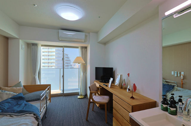 エアコン、福祉対応型温水洗面台、洗浄機能付トイレ、介護用電動ベット、緊急時コールボタン、クローゼット、カーテン (Bタイプはミニキッチン付属) |