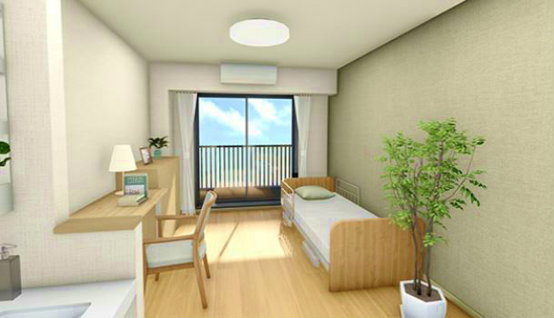| 居室設備 | 介護用電動ベッド、寝具、冷暖房、カーテン、クローゼット、トイレ(全居室完備、洗浄機付)、洗面台、照明、見守りセンサー、消防設備(自動火災報知設備、スプリンクラー)、テレビ回線、ナースコール(2カ所/トイレ・ベッド) |
