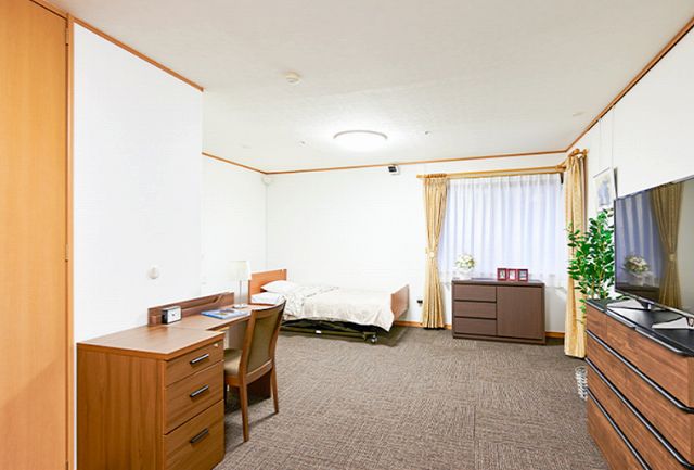| 居室設備 | エアコン、照明、カーテン、ナースコール、電動介護ベッド、洗面化粧台、車椅子対応トイレ、クローゼット、テレビ配線、見守りシステム等 |