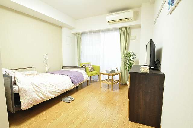 | 居室設備 | 介護用電動ベッド/寝具/照明/冷暖房/クローゼット/洗面所/トイレ(洗浄機能付)/防炎カーテン/ケアコール/テレビ回線/電話回線/防火設備(スプリンクラー、熱感知器、非常時放送スピーカー) |