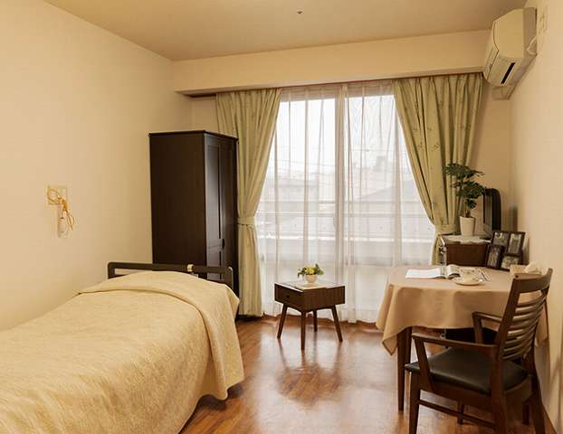 | 居室設備 | 全室冷暖房完備・介護ベッド・チェスト・テーブル・イス・14型テレビ・カーテン・ナースコール等 |