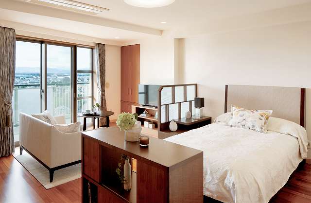 居室:バリアフリー居室で生活安全センターと緊急コールが完備され、安全安心で健康的なシニアライフをお楽しみいただけます。またプライベートルームは50m2が標準なので、安心、安全でゆったりとお過ごしいただけます。