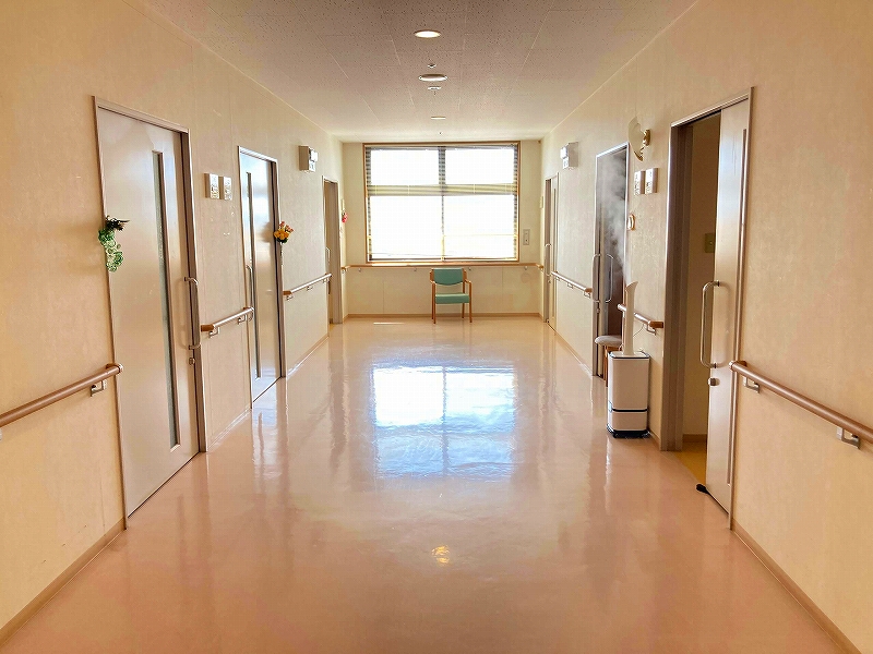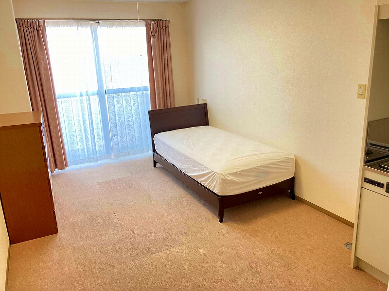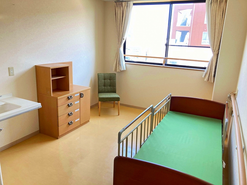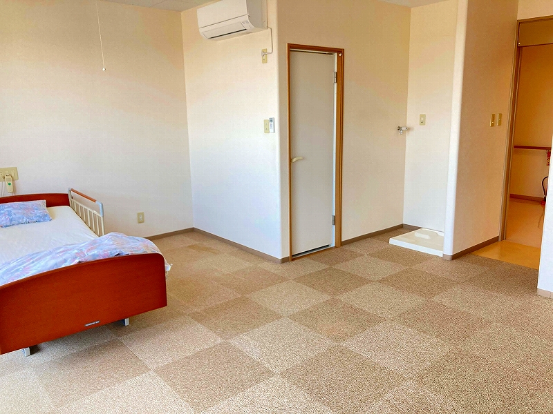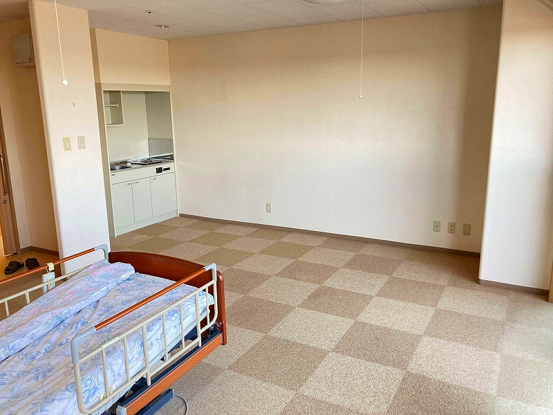 | 居室設備 | 地上波デジタルアンテナ、電話回線、ミニキッチン、電磁調理器 、玄関引き扉、下駄箱、タンス、手すり、フローリング、防災設備、ナースコール、空調換気設備、照明器具、間接照明、エアコン、電動介護ベッド、カーテン、防火カーテン、鍵、寝具一式 |