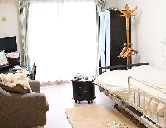 | 居室設備 | 全室冷暖房完備・介護ベッド・チェスト・テーブル・イス・14型テレビ・カーテン・ナースコール等 |