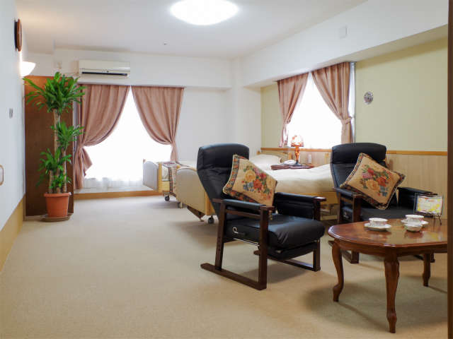| 居室設備 | ベッド、寝具一式、ワードローブ、ナイトテーブル、リクライニングチェアー、緊急通報付電話機、緊急コール、ペンダントコール、床暖房、カーテン、エアコン、テレビ、照明器具、テーブル、椅子、3点式ユニットバス |