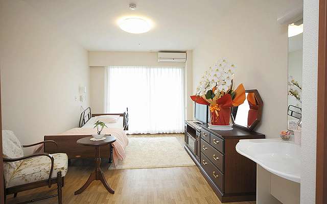 | 居室設備 | エアコン、(加湿機能付)、トイレ(温水洗浄暖房便座付)、洗面台、ベッド(介護用電動3モーター付)、収納、カーテン、ナースコール、テレビ配線、電話配線、スプリンクラー |