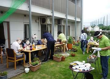 1Fはウッドデッキになっており、庭がとても広い作りになっているので、お食事をしたりと楽しく過ごすことができます。自然と触れ合うことのできる広い庭でのびのびガーデニングや家庭菜園、利用者様どうしのなごやかな語らい、趣向を凝らした季節感あふれるイベントをお楽しみいただけます。また、廊下や浴室、トイレなどには安全のためや、自立度やQOLの向上のため、手摺りなどを設けています。