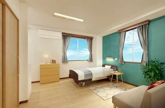 | 居室設備 | 介護用電動ベッド、寝具、冷暖房、カーテン、トイレ(全居室完備、洗浄機付)、温水器付洗面所、ミニ冷蔵庫、ソファベッド、電子レンジ、 照明、消防設備(自動火災報知設備、スプリンクラー)、テレビ回線、ナースコール(2か所/トイレ・ベッド)、見守りセンサー |