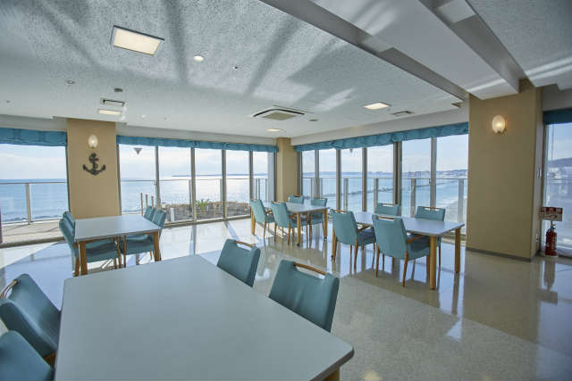 機能訓練スペースでは、海を見ながらご自分のペースで楽しくトレーニングを行えます。ハードに実施するもよし、リフレッシュ目的でゆっくり身体を動かすもよし。安全に配慮しご要望により職員がマンツーマンでお見守りいたします。トレーニングの後は、潮風と日差しいっぱいのバルコニーでの外気浴が人気です。