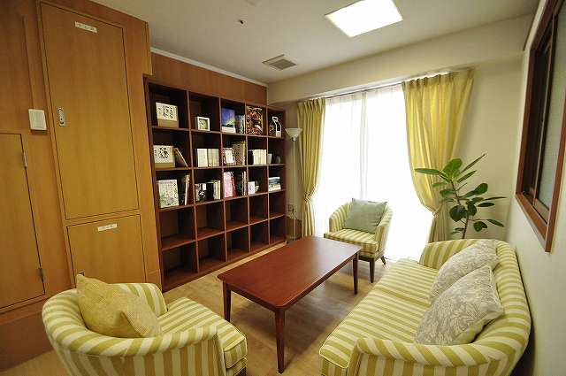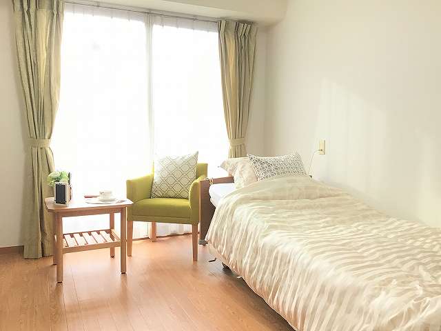 | 居室設備 | 介護用電動ベッド・寝具・照明・冷暖房・チェスト・クローゼット・防火カーテン・ナースコール(2ヶ所)・コンセント・洗面所・防火設備(スプリンクラー、熱感知器、非常時放送用スピーカー)・トイレ・TV回線 |