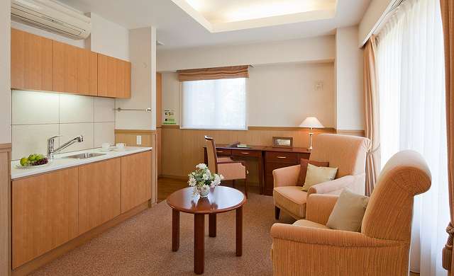 | 居室設備 | 家具(チェスト・テーブル・いす)、カーテン(レース・ドレープ)、エアコン、クローゼット、介護対応型電動ベッド(寝具付)、緊急コール、車いす対応洗面台、温水洗浄機能付きトイレ、シューズボックス、玄関ディスプレイボックス |