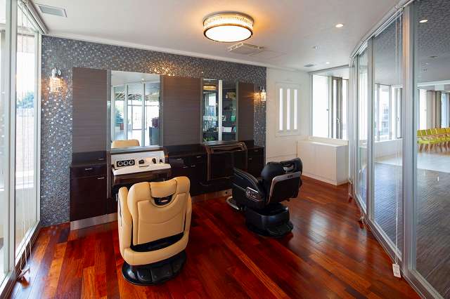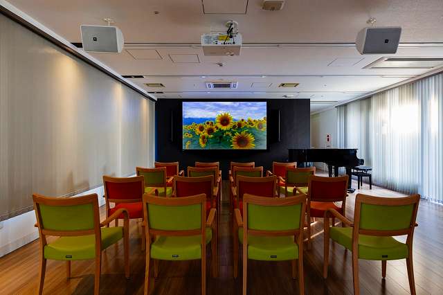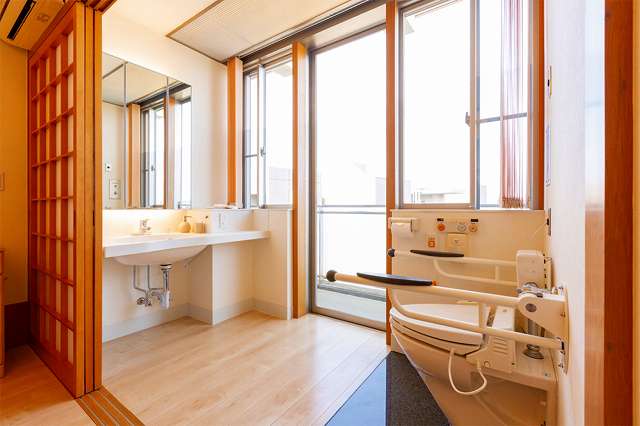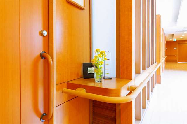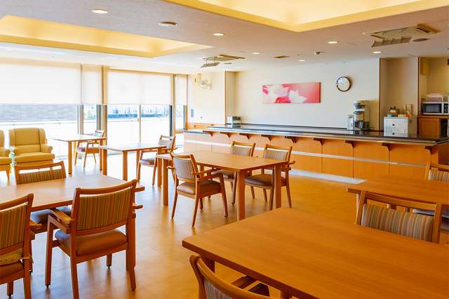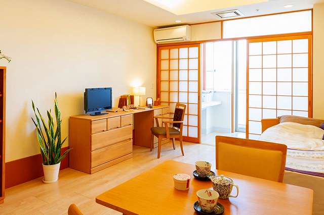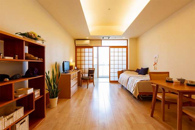 | 居室設備 | 地上波アンテナ、インターネット接続口、電話回線、玄関引き戸扉、床頭台、居室内仕切戸、フローリング、フラットフロア、ナースコール、防災設備、空調換気設備、間接照明、エアコン、電動介護ベッド、温水洗浄機能付きトイレ、車椅子対応洗面化粧台 |