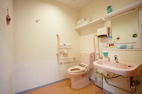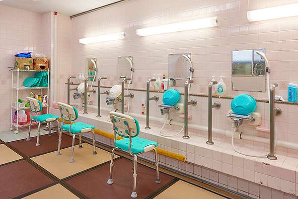 共有スペースは車イスに対応した共用トイレや、ご入居者様で、のんびり寛いで頂く談話コーナー、陽のあたる食堂がございます。また、浴室には畳が敷かれており安全かつ暖かみのある大浴場となっております。
