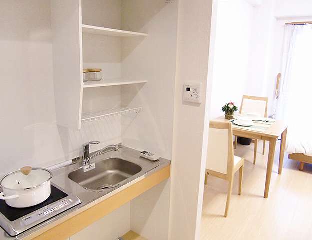 | 居室設備 | トイレ、洗面台、エアコン、スプリンクラー、ベット、浴室、自動火災報知設備、放送設備、暖房洗浄機能付トイレ、洗濯機置き場、車椅子対応IHクッキングヒーター付ミニキッチン、照明器具 |