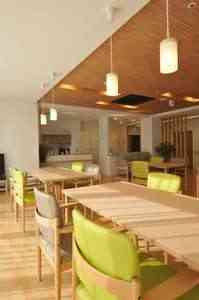 外壁には、シンプルさと高級感を併せ持つモノトーンタイルを採用。地域の風景と調和したデザインとなっています。バルコニーの手摺はガラスを使用。2階、3階の室内からでも光や緑を多く取り込むことができます。食堂は、木目調の材料を多用することにより、明るさと清潔感のある空間が広がります。