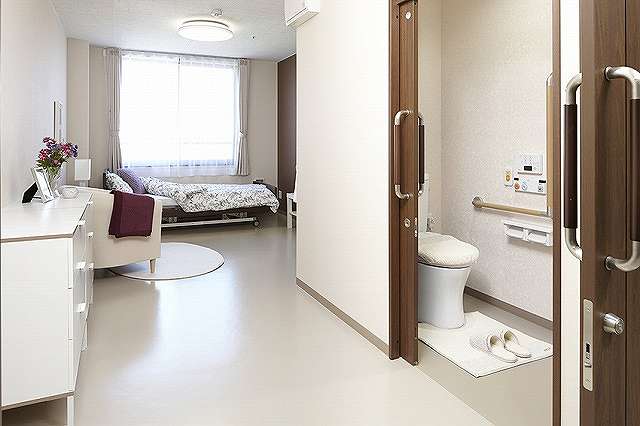 | 居室設備 | 洗面台、温水洗浄便座付トイレ、エアコン、電灯、介護ベット、布団一式、カーテン完備 |