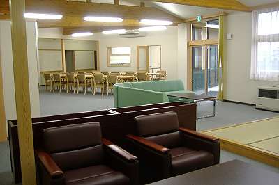ホール(テレビ・ビデオ完備・和室(堀りこたつ)あり・自販機有り・食堂(日当たり良好) 男女共用浴室(シャワー付き)・男女別共用トイレ(水洗洋式)、車イス用トイレ・共用洗面所 家事室(洗濯機・乾燥機 完備)※乾燥機のみ有料・台所(職員が賄いのために使用) |