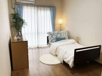 | 居室設備 | 緊急通報装置 テレビ回線 エアコン クローゼット 防災設備 空調換気設備 照明器具 電動介護ベッド カーテン 寝具 車椅子対応トイレ(2居室共同設備) 車椅子対応洗面化粧台(2居室共同設備) |