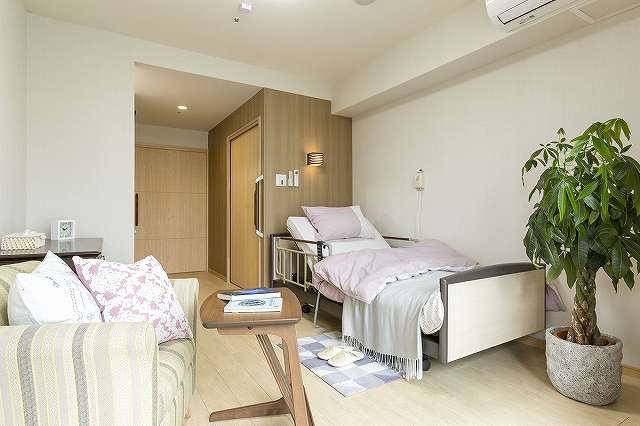 | 居室設備 | 電動ベッド、照明、エアコン、クローゼット、洗浄機能付きトイレ、温水器付洗面台、ケアコール(二ケ所)、電話回線、見守りシステム、防火設備(スプリンクラー、熱探知機、非常時放送スピーカー)、寝具、防災カーテン |