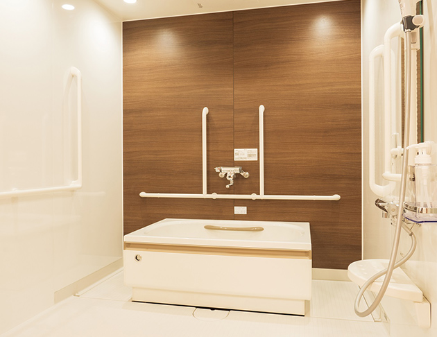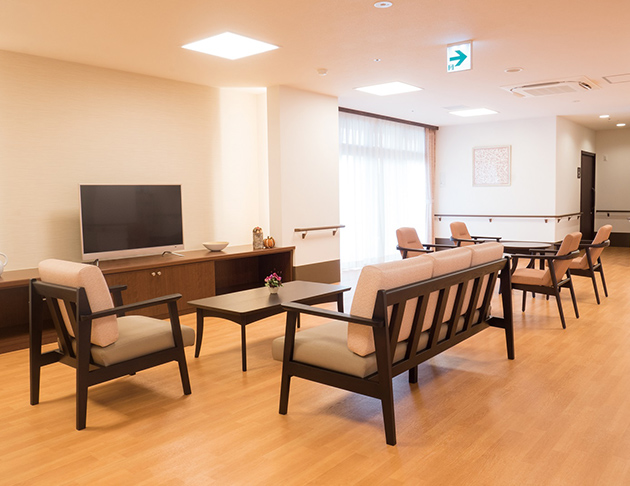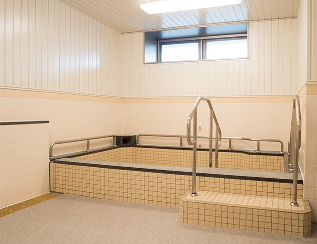 共用部:大きな窓と広く明るい空間に食堂兼機能訓練室があるので、ゆったりとお過ごしいただくことができます。また浴室は個浴や大浴場の他に機械浴もありお身体の状態に合わせた入浴ができますので安心です。