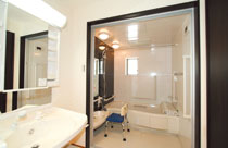緊急コール、洗面台、冷暖房完備。食堂、台所、浴室、洗濯室、など、介護職員のサポートが必要な場所はすべて共用になっています。