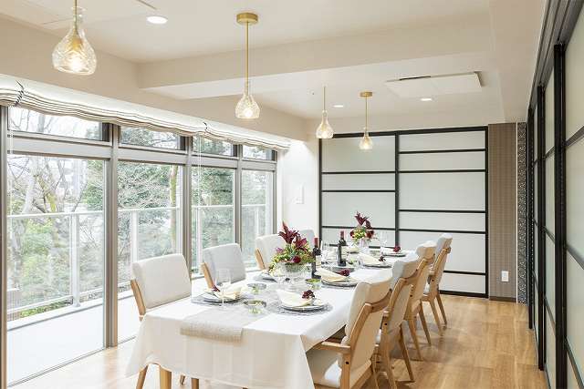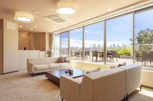 | 共有設備 | グランドダイニング、ファミリールーム、ラウンジ、機能訓練室、ビューティーサロン、和室ゲストルーム、応接室、エレベーター、個浴、スカイラウンジ、屋上ガーデンテラス、トイレ |