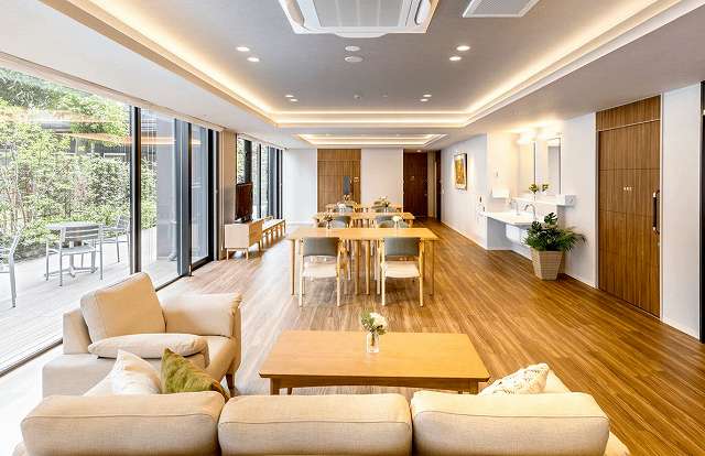 | 共有設備 | テラス、ロビー、フロント、ウッドデッキ、エレベーター、ナースコール、スタッフルーム、一般浴室、健康管理・相談室、共用トイレ、厨房室、囲碁、寝台用エレベーター、将棋、屋上施設、放送設備、機械浴室、汚物処理室、洗濯室、玄関ホール、理美容室、異常監視システム、バイク置き場、自販機、車椅子用トイレ、避難設備、防災設備、風除室、食品庫、ダイニングルーム(食堂)、駐車場、駐輪場 |