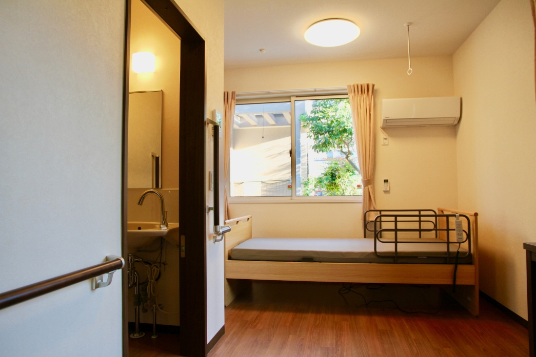 | 居室設備 | トイレ温水便座、エアコン、ナースコール、クッションフロア、バリアフリー、地上波アンテナ、BSアンテナ、冷蔵庫、カーテン、介護用ベッド、引き戸式ドア、照明器具、洗面化粧台、避難設備、防災設備、トイレ内手すり、室内物干し器具、収納、リフト浴、防火カーテン |