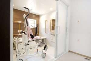 1階には寝たまま入浴できる特殊浴槽があり、厨房ではさらに詳しく
