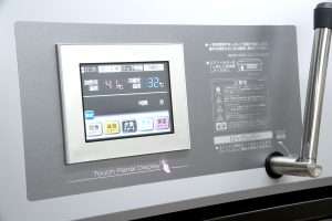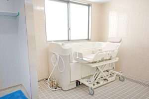 1階には寝たまま入浴できる特殊浴槽があり、厨房では安心安全なお食事をお届けするために、再加熱カートを使った「ニュークックチルシステム」を導入しております。