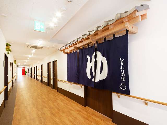 他にも、共同浴室の前には温泉や銭湯を連想させる「湯のれん」や、食堂入口に灯る「行灯」などで、ご入居者様を温かくお招きしています。