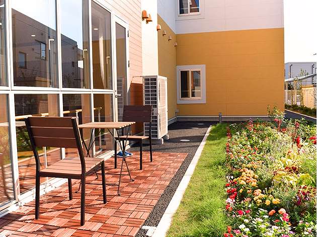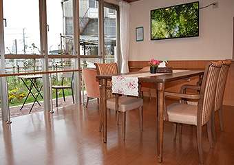 暖かい季節にはご入居者様と一緒にお庭でお花を眺めながら日光浴など団らんされています。また、暑さや寒さが厳しい時期にも、リビングの大きな窓からお庭を眺めることができます。