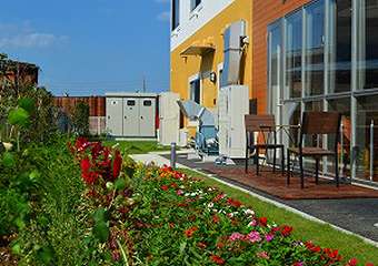 アプリシェイト柏高柳 グリーンガーデン(サービス付き高齢者向け住宅)は緑に囲まれた自然豊かな環境と、高柳駅から徒歩5分の好立地。黄色い壁が目印です。明るい色合いと木の温もりを感じられる外観で、ご来訪者様にも「綺麗ですね!」とお声をいただいています。