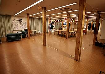 大きな窓を取り入れたことにより、1階リビングには陽の光が多く入り明るい環境でお過ごし頂けます。日中には大きなリビングでレクリエーションが行われています。