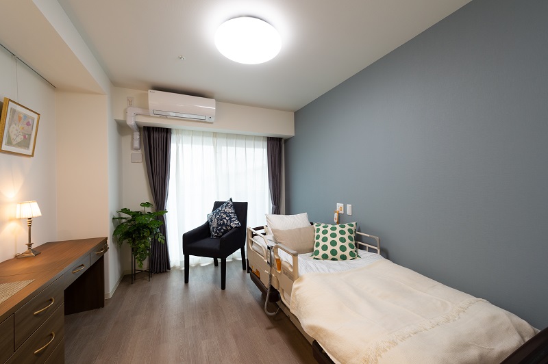介護用電動ベッド(寝具付)、ナースコール、車いす対応洗面台、温水洗浄機能付トイレ、チェスト、クローゼット、デスク、メモリーボックス、カーテン(レース・ドレープ)、エアコン、ミニキッチン※1 ※1 居室IIIのみ |