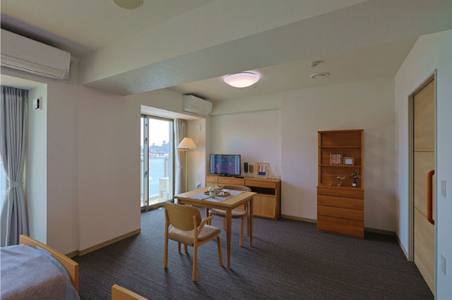 エアコン、福祉対応型温水洗面台、洗浄機能付トイレ、介護用電動ベット、緊急時コールボタン、クローゼット、カーテン (Bタイプはミニキッチン付属) |