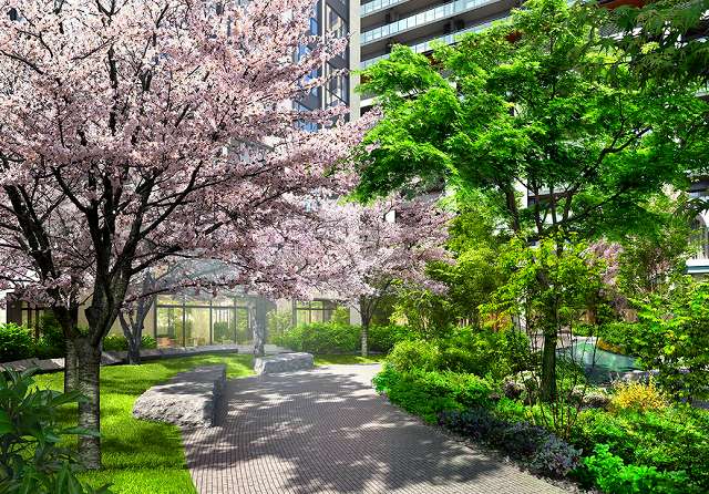 敷地内には、水辺を中心に様々な緑景が連なる広大なプライベートガーデンをご用意しています。桜をはじめ、季節とともに花を咲かせる草木に満ち、散策を楽しめる遊歩道や水辺の風景に癒され、四季の移ろいを感じながらお暮らしいただけます。
