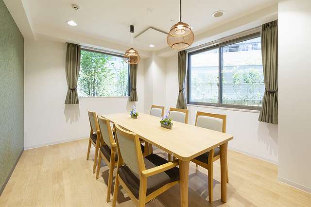 | 共有設備 | エントランス、ラウンジ、事務室、健康管理室、相談室、ダイニング、ファミリーダイニング、厨房、理美容室、リハビリルーム、ガーデンテラス、浴室(一般浴槽・機械浴槽)、湯上りスペース、共用トイレ、エレベーター2基、リビング、サブダイニング(4階)、ルーフバルコニー、汚物処理室、スプリンクラー、火災通報装置 等 |