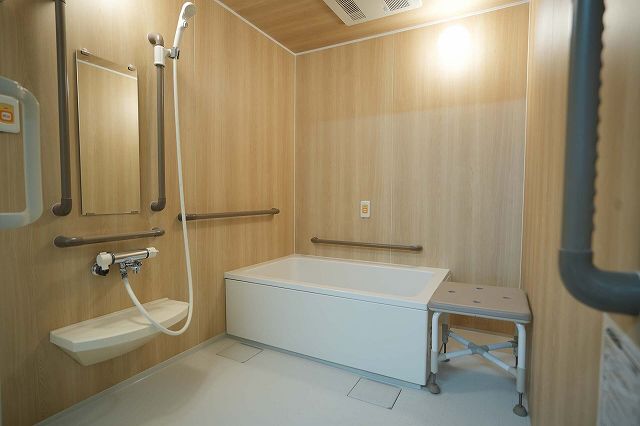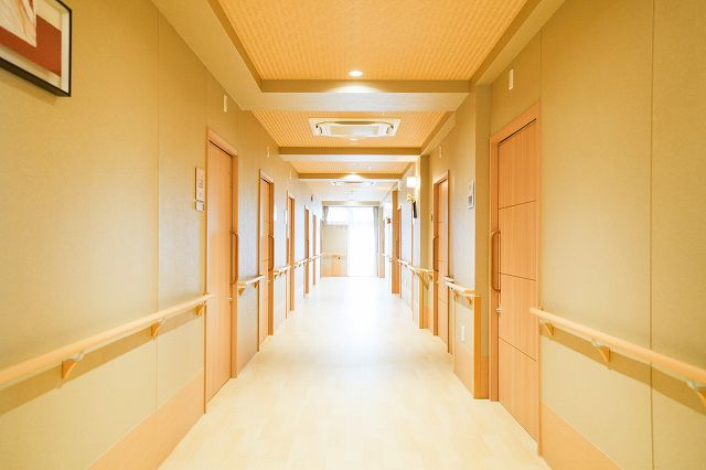 グレー基調の壁に木製のルーバーを組み合わせた和風モダンな外観、木目調で明るく心安らぐ内装デザイン、高齢者の方が生活しやすいバリアフリー構造など、過ごしやすい環境をご提供しています。