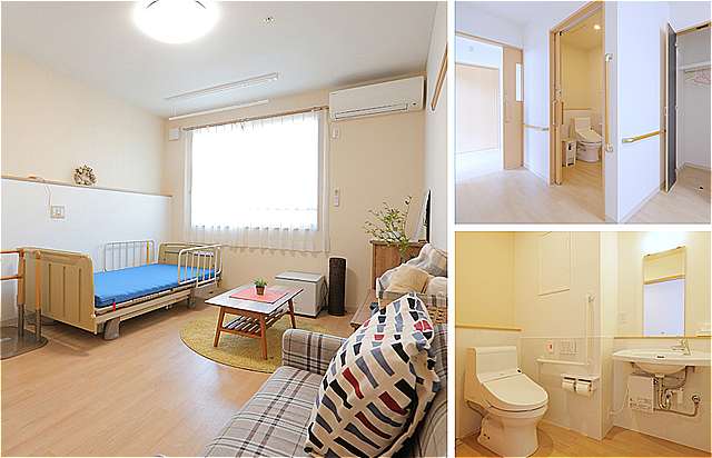 | 居室設備 | 車椅子対応トイレ、エアコン、クローゼット、ナースコール、TV配線、 照明器具、室内干し、電気温水器 |